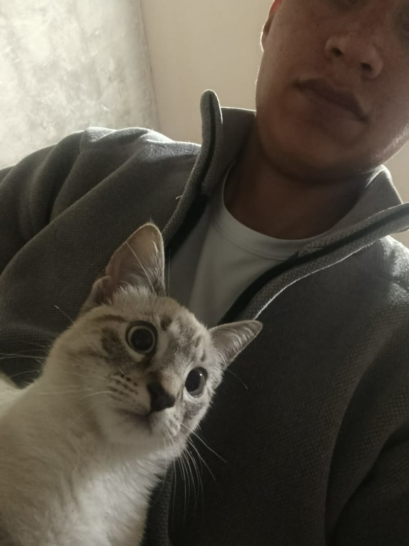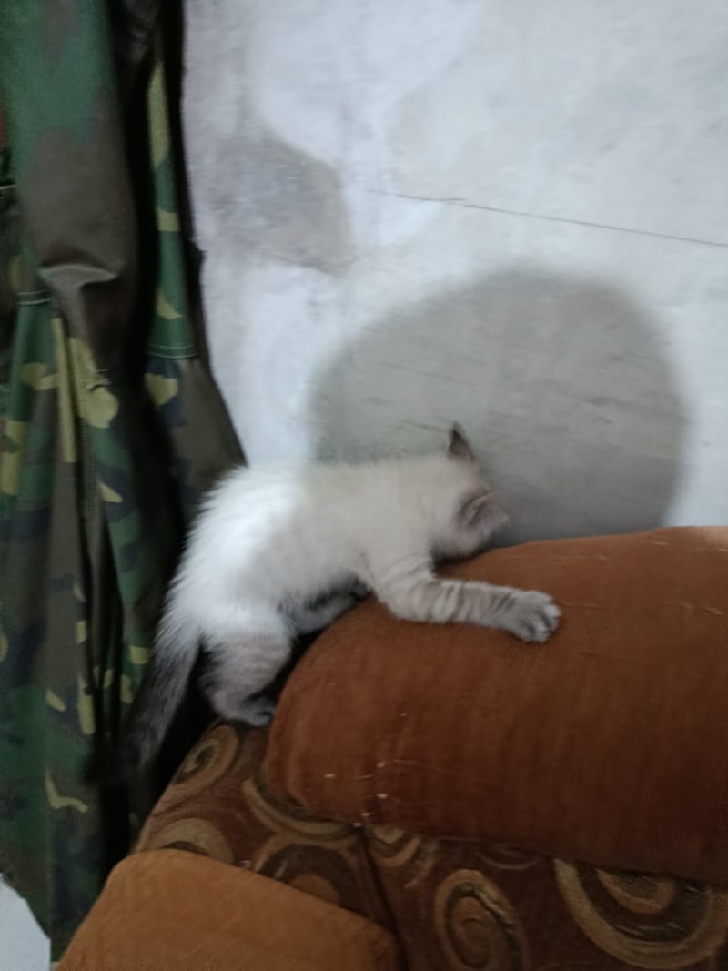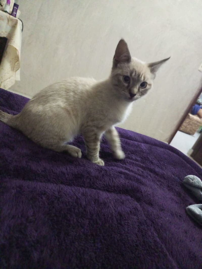 Tiene Ojos celestes, cola negras tipo anillados, orejas con mancha negra en las puntas, patitas negras/gris rauadas es Cariñosa